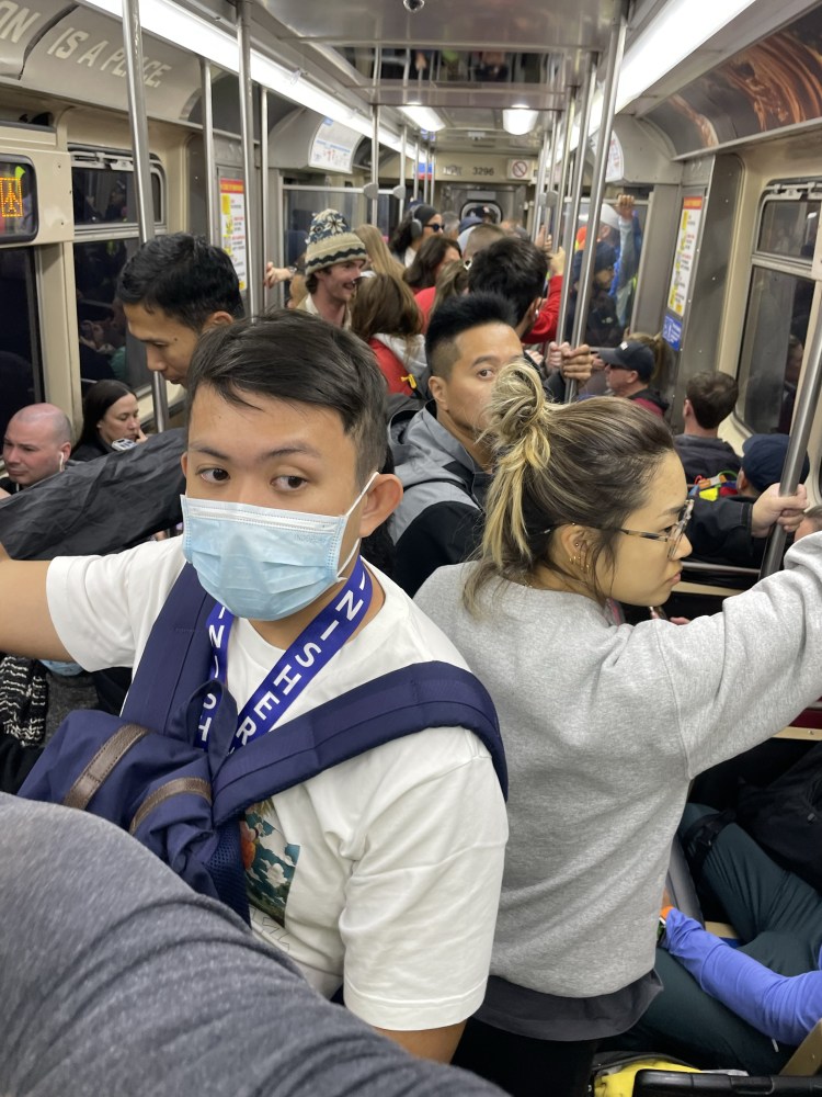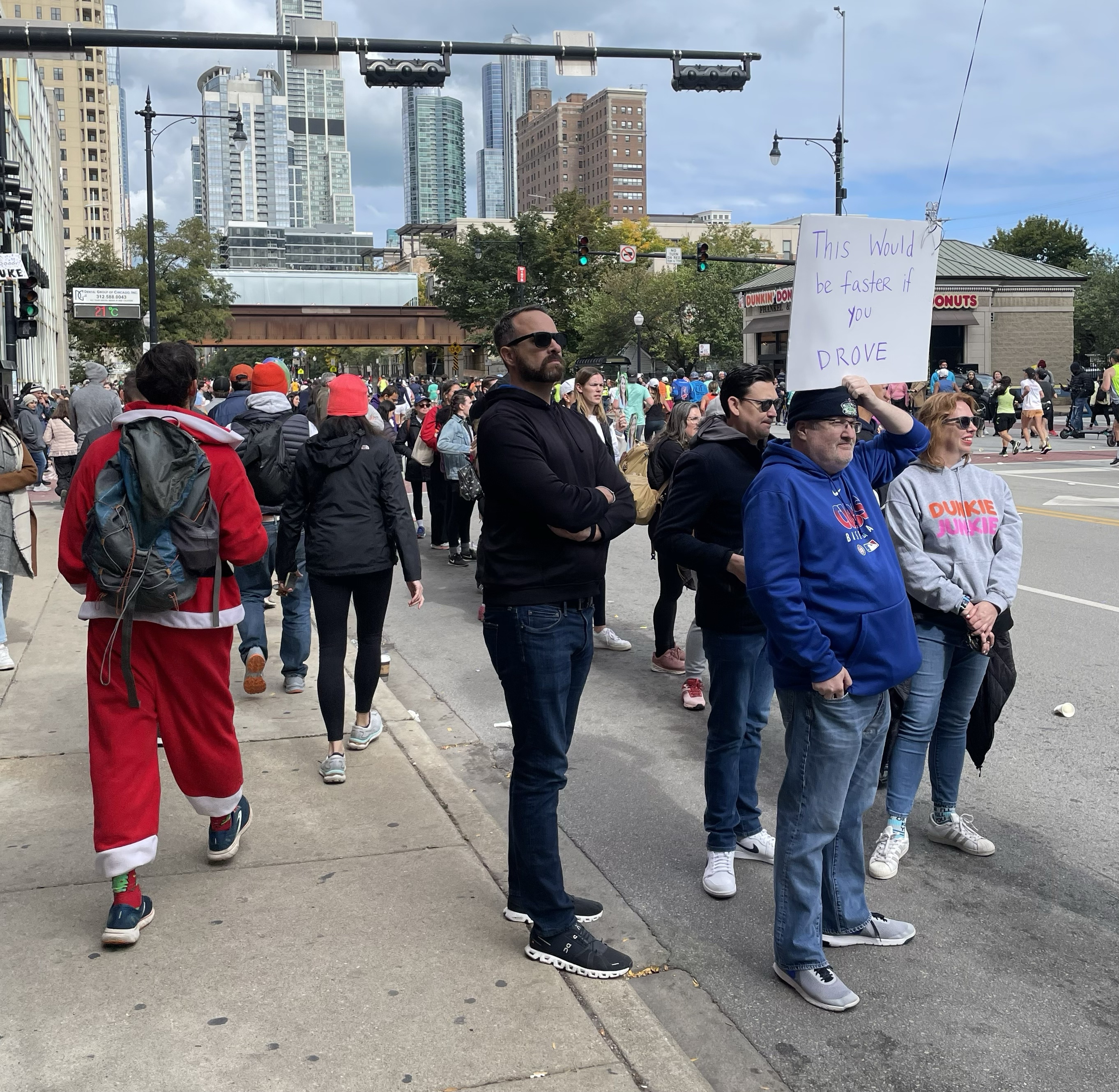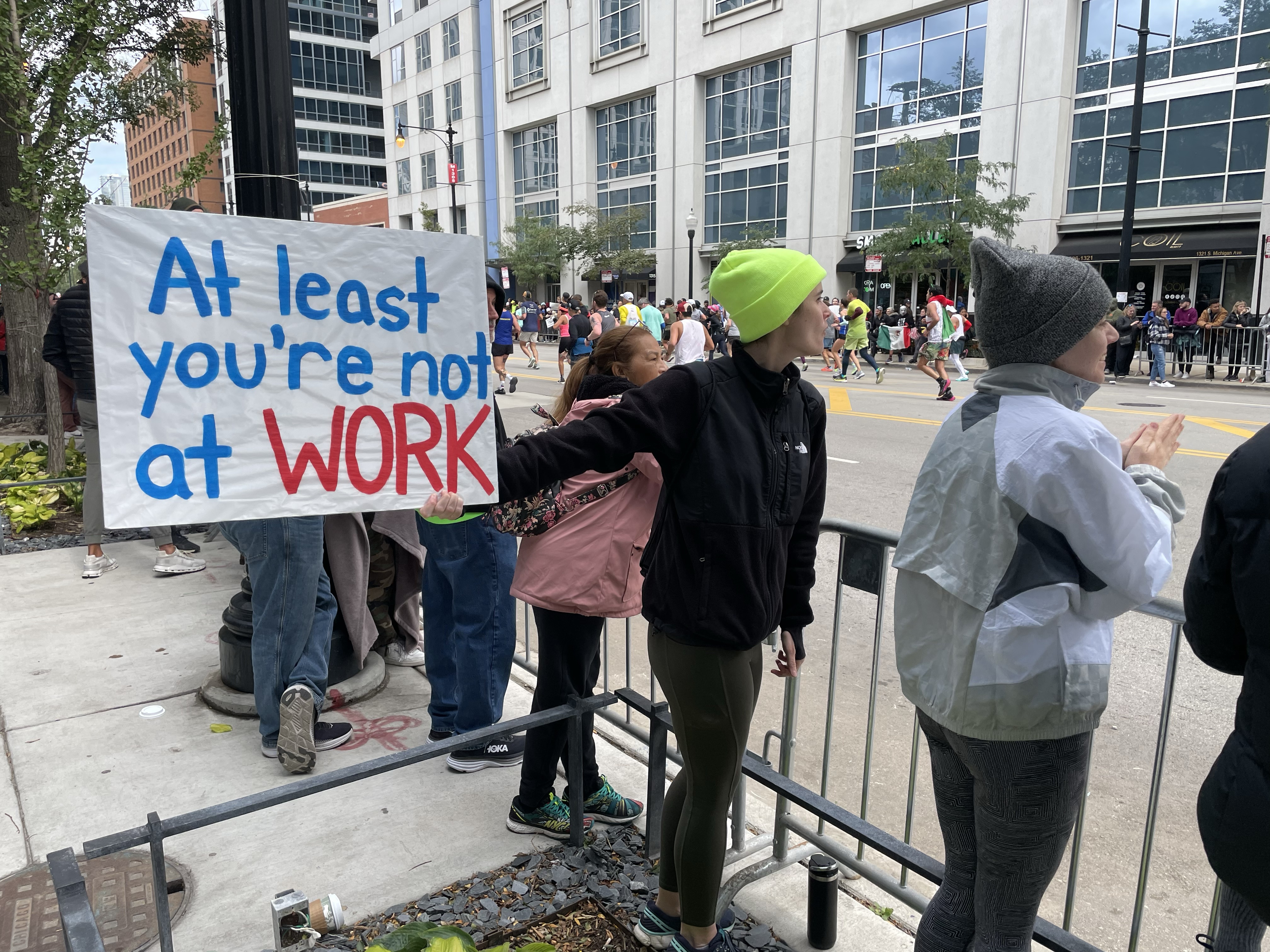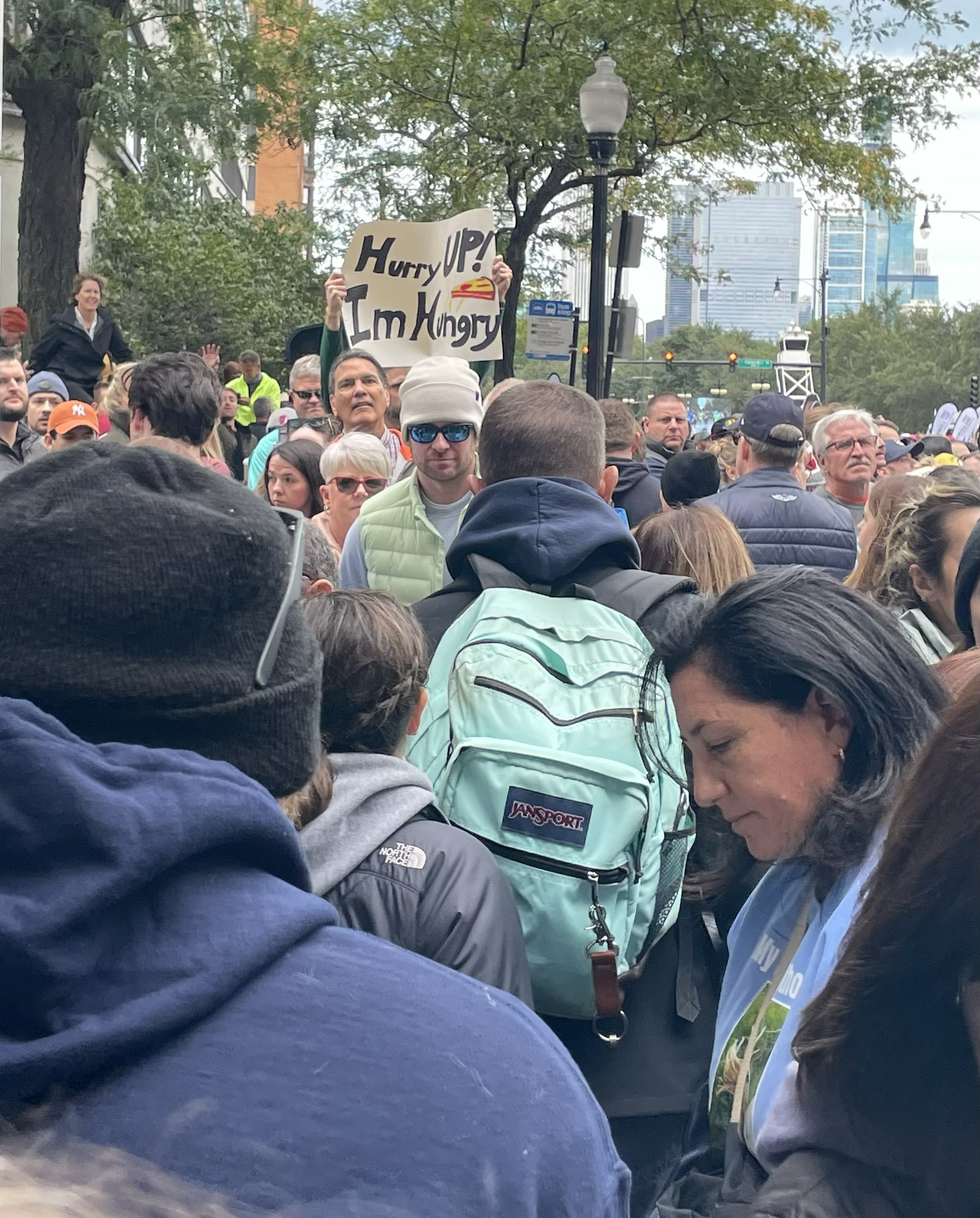 Supposedly, I have time to observe the crowds – and find a place to fit in amongst them – when I arrive in Chinatown. In fact, I manage to eventually finagle a spot right at the fences, and hold up my sign for a good fifteen, twenty minutes, checking my tracking app occasionally to ensure that I haven’t missed her (although this section of the route is narrower than others, allowing a fairly complete view of the runners as they pass by).