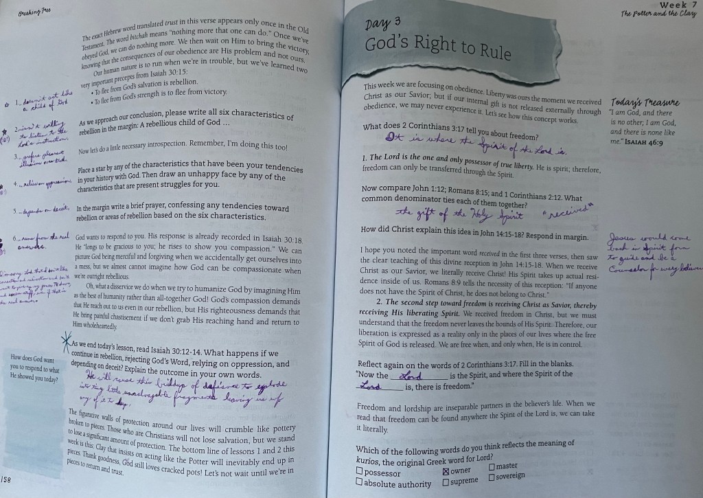 To this day, I’m no more sure that I’m listening to Him than you claimed to be when you filled this study out; free in His will in some places and situations, but bound by your own compulsions in others. For all that we keep striving to do better, we never succeed, and even if we do for a moment or two, we can’t sustain it for a lifetime, imperfect as we are. I wish I had more encouragement to write here – or that you could contribute to these letters, as you might have plenty of that to add from your side, if you could – but I’ll have to leave things as they are for now.