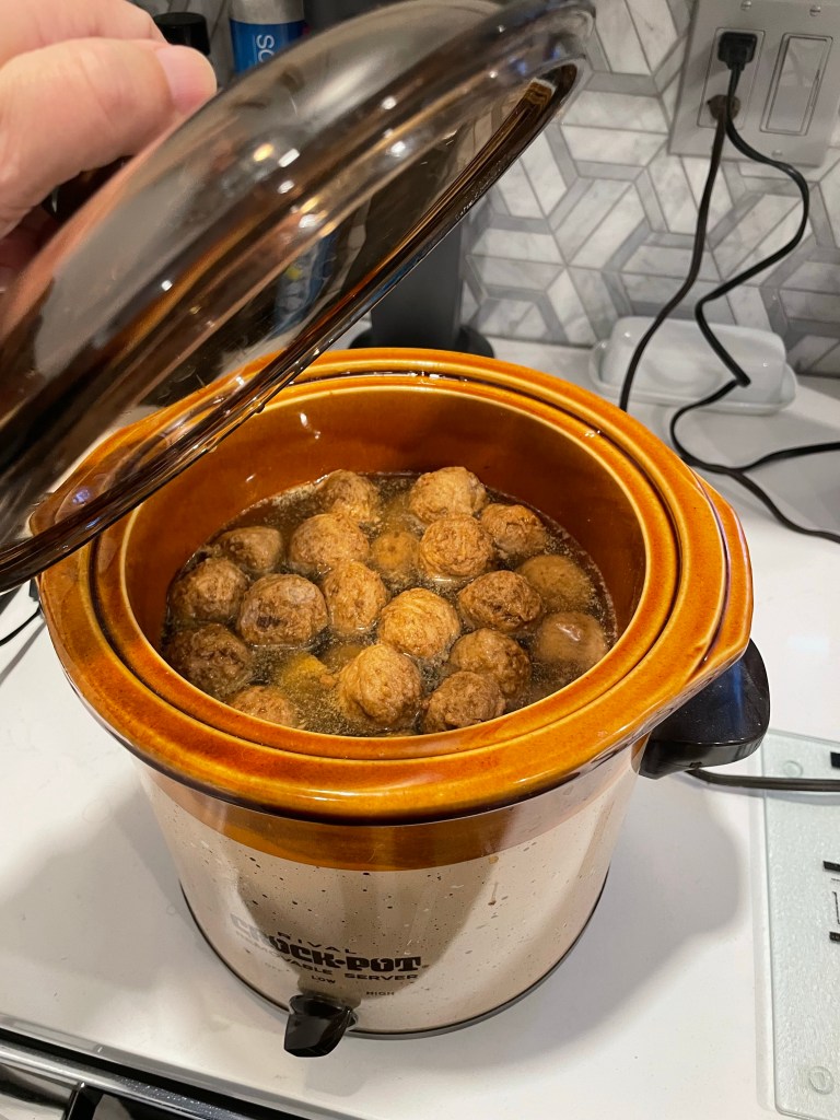 In contrast to my Thanksgiving attempt at making dirty rice, neither the meatballs nor the curry came with preparation instructions for use with a crockpot – only (like with the dirty rice) for microwave and stove top cooking (and oven baking, for the meatballs, but that’s no more applicable). So basically, I was working without instructions at all this time around. An optimist might conclude that, therefore, there are no wrong methods to prepare this dish, then.