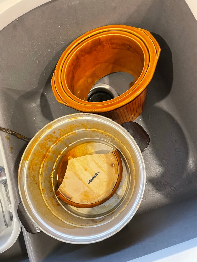 And this is how we took everything over to Jenn’s place, honey. I don’t know how you would have reacted to all this chaos – you probably wouldn’t have tried such an experiment in the first place, so you wouldn’t have had this to deal with, to be honest – but I’m sure you would have been dismayed to have to throw out the slow-cooker. Don’t worry, though; I’m told that, if I really wanted to replace it (and given that I know we haven’t used it since you’ve left – and probably not for a number of years previous – I can’t see why), I could find one for between twenty and thirty dollars, easily. Barely the price of a nice dinner out, really.