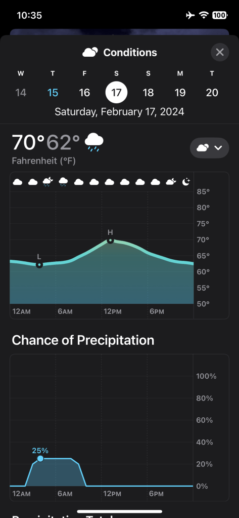 I’m also likely to get wet, as Hilo is one of the wettest cities in the United States. It receives an average annual rainfall of around 126 inches (about 3200 millimeters). Rainfall is common throughout the year in Hilo, with precipitation occurring on most days. The city’s location on the windward side of the Big Island of Hawai’i exposes it to moisture-laden trade winds, resulting in frequent rainfall. This abundant rainfall contributes to the lush green landscapes and vibrant vegetation that characterize the area – so at least it has the benefit of rendering it that much more picturesque.