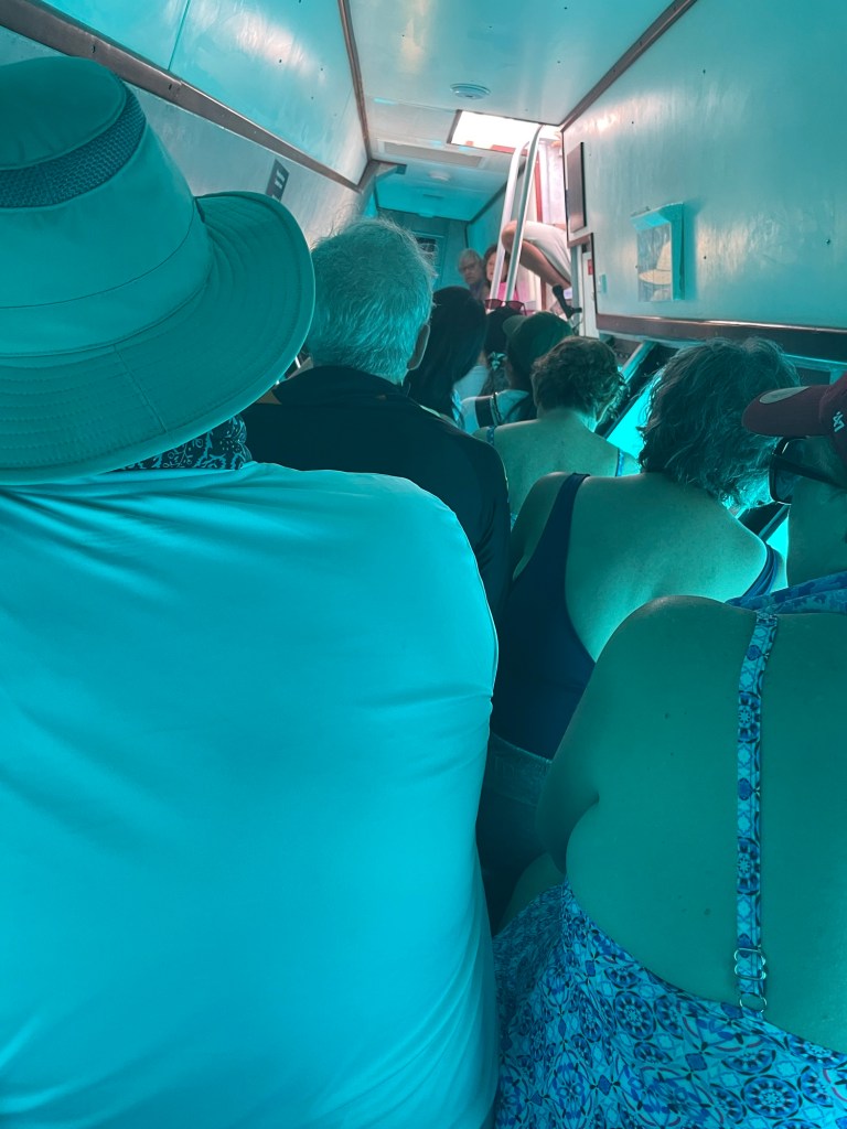 It took a good half hour (at least) to get from the fifth deck to the second, where the catamaran was waiting for us. It was more like the ferries shuttling us between the ship and shore at Shute Harbor; for a brief moment, I had rather expected something along the lines of the craft that I rode in Pape‘etē, ignoring the fact that, given the crowds going on this particular excursion, we would need a flotilla of such craft to accommodate everyone.