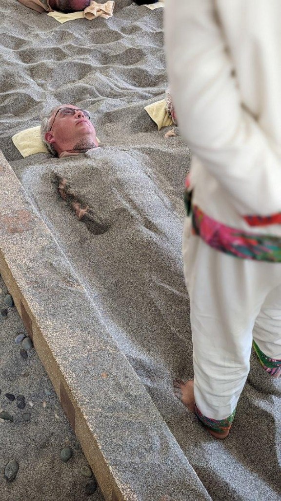 Once there, we were given a button-up tunic and elastic-banded, one-size-fits-most shorts that make us look like novitiates for some strange eastern religion. The fact that we’re then to lie down in this pit of hot sand while the staff shovels it (gently!) over us adds greatly to that impression, to be honest.