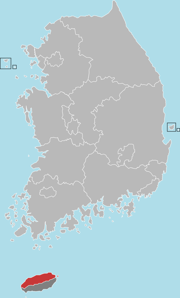 As you can see, Jeju city is on the north side of the island – the largest by far throughout South Korea – which is some distance off of the southwestern coast of the Korean peninsula. Even by taking up only half of the island, the city is still pretty large, at just under a thousand square kilometers. Although with a population of just under half a million, the city is thereby considerably less dense than our hometown, by a factor of somewhere between three and four.