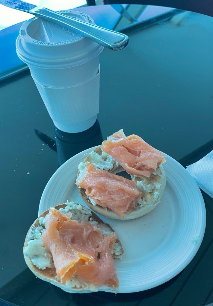 You’re probably wondering why I’m overdosing myself on carbs, rather than consuming protein this morning. To be honest, honey, I think I’ve had enough bacon and sausage and the like to keep me for quite some time. Besides, some of this stuff, I’m not gonna have for a very long time – bacon and sausage I can get elsewhere once I get back home, but bagels and lox, let alone the coffee prepared the way I like it, that’s not happening until I get on another cruise ship, I shouldn’t wonder.