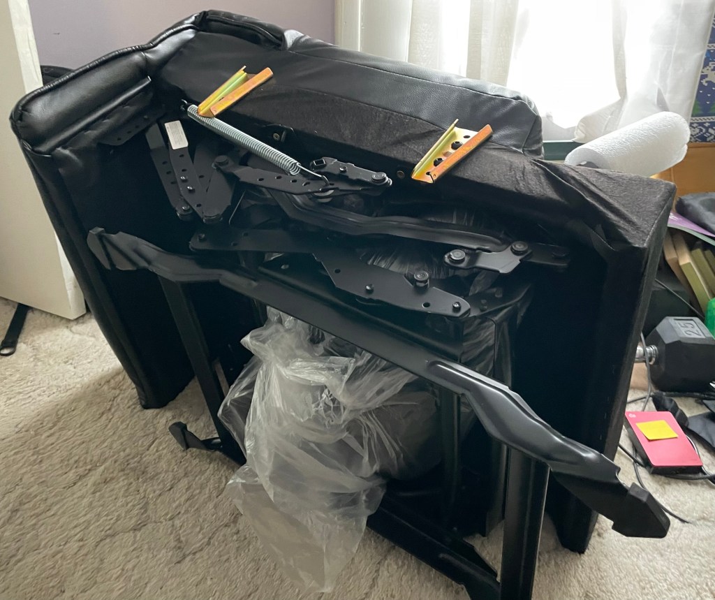 And yes, there was one; you didn’t think it would show up at the door fully assembled? Much as I would have preferred it to have been (or at least, for it to be a two-piece base and back combination that I could just slide together), that wouldn’t have been reasonable to expect, given that the shippers would want to condense everything into as small a box as possible for shipping purposes. Indeed, the box was so small that, when it arrived last Friday (earlier than expected – I’d assumed it wouldn’t arrive until the weekend, and I would put it together over the Memorial Day holiday), I actually didn’t notice it (to be fair, I had turned to go directly into the kitchen upon getting home, as I had plans to prepare something for the three of us for dinner. Had I gone straight to the bedroom, I would have been able to get past the box, but I wouldn’t have missed it); Logan even questioned me as to whether I’d confirmed that the chair was actually full sized, which admittedly would be embarrassing, to say the least.