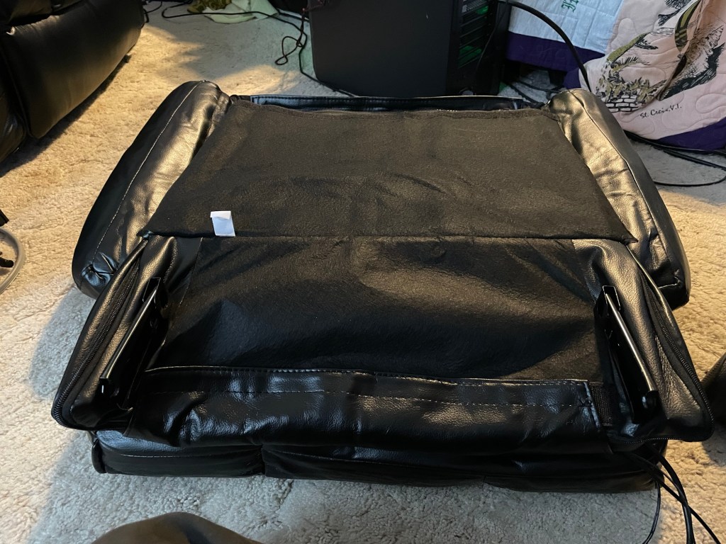 At the same time, I haven’t thrown out the old chair just yet, which might please you, apart from the fact that it’s now setting on your old side of the bed. For whatever reason (like I said, I might have assembled the old chair poorly), I can’t seem to separate the back of the old chair from the base. Because of that, I don’t dare try to force it out through either bedroom door. So I just hauled it around the bed, and set it on the other side. At least now there’s another seat apart from the bed itself for people to come in and watch stuff on the big screen, should they so choose to.