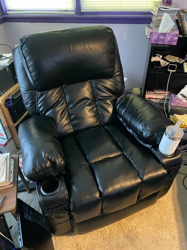 So, yeah; there it is. All tricked out with stuff I’ve never had in such a chair before. They’ll take some getting used to – and I doubt I’m going to be using the heat function any time soon, what with summer coming in and all – but at least I’m not listing over to one side or anything like that.
