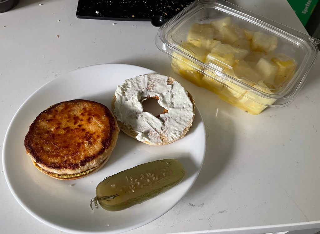 At this point, my stomach finally woke up (now that it had finally gotten something to process, I guess) and pointed out that this was hardly enough to call a meal. Besides, the bagels, thin as they are, only amount to a hundred calories each, and several of them had to be pitched to the birds, owing to improper (and too-lengthy) storage; might as well take care of another one, wouldn’t you say?