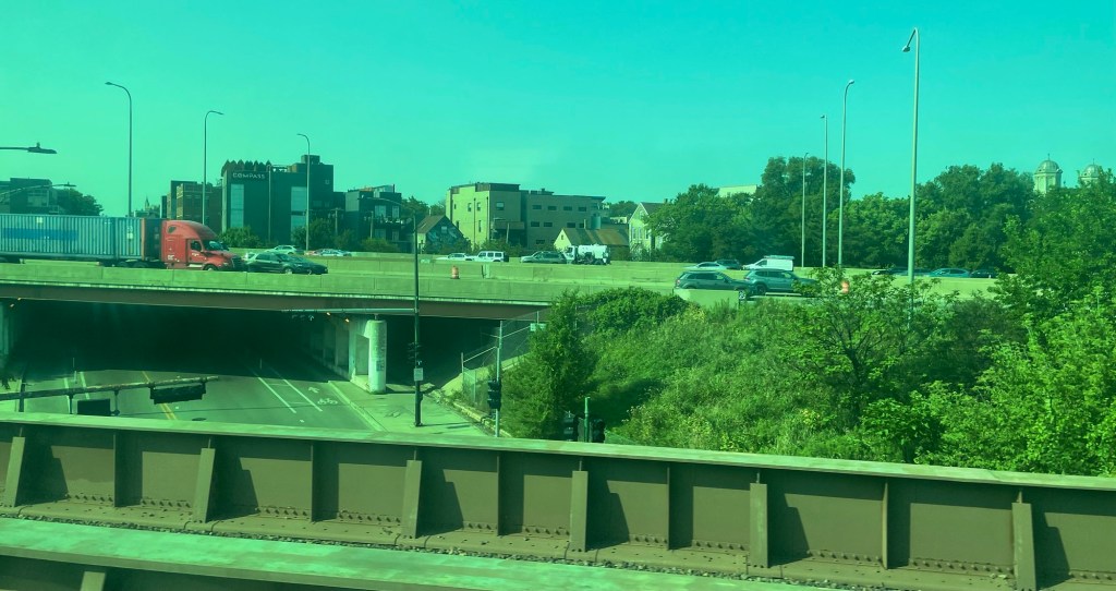 To be sure, most of what I’m seeing – apart from the near-total wall of trees and bushes in many area – are the backsides of industrial park buildings; nondescript boxes of brick and corrugated steel. It’s the sort of sight that I’m sure provokes many a commuter from even thinking about the things that they’re passing by on a near-daily basis. These things are just… there… and that’s all.