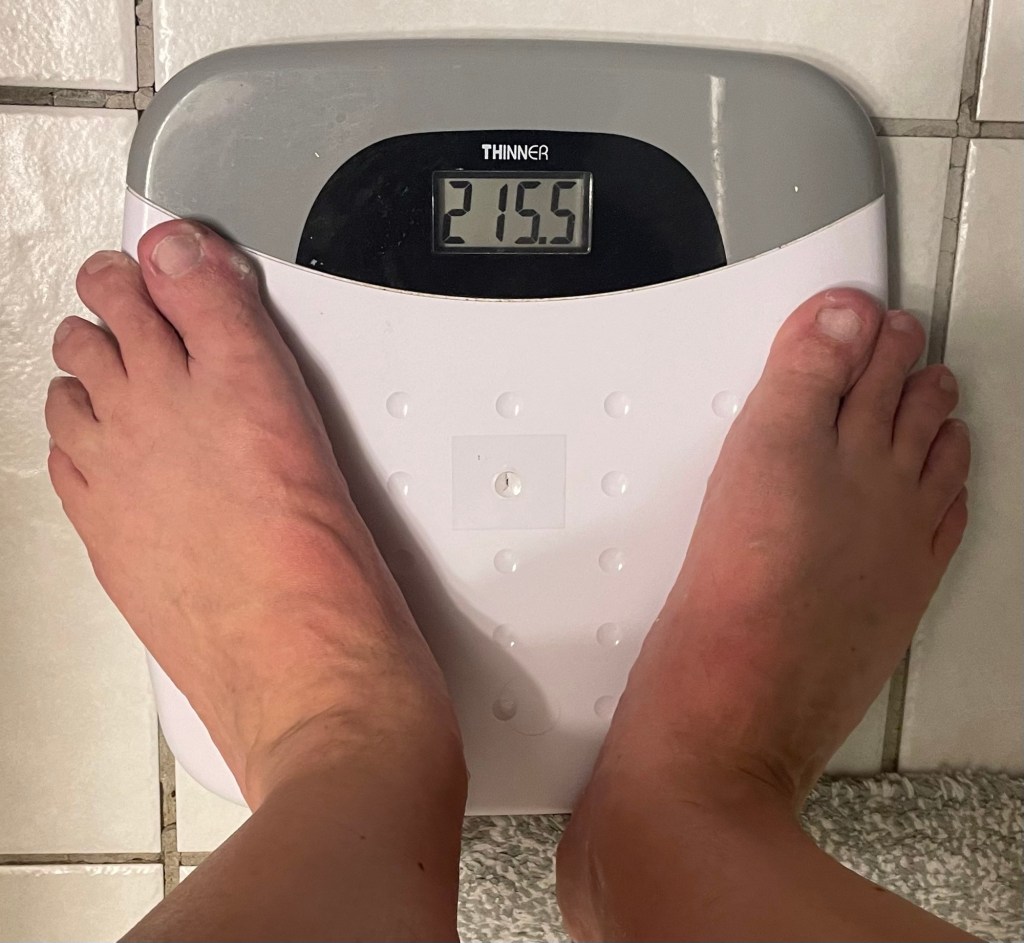 So, after doing a hundred reps on various weight machines, and an hour or so of walking four miles uphill, I’m rather looking forward to seeing where I land. Will I reach – or even cross – the 215 mark?