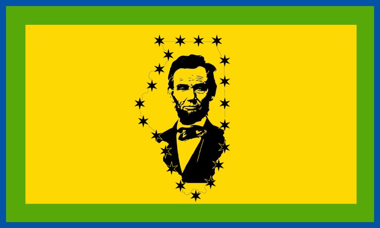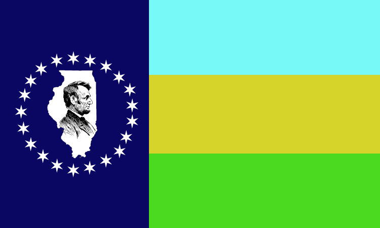 I had thought of doing a flag with a split screen layout, with nighttime in the city (and a single six-pointed star illuminating the night) and daytime in the country (with a golden disk in the light blue sky representing the sun watching over the prairie, and a vertical bar in the middle with Lincoln looking toward the prairie sun in the fly, which could be a subtle inclusion of the letter “I” (hey, Ohio gets away with a circular buckeye initial in their flag). On the other hand, given what I’ve already said about Chicago, this might be too blatant a repudiation of the city, even if the skyline takes up nearly half of the flag in the hoist. Besides, trying to represent all that would be way too complex for a good flag; mine are already a little close to being outside of the capability of a five-year-old to recognizably draw.