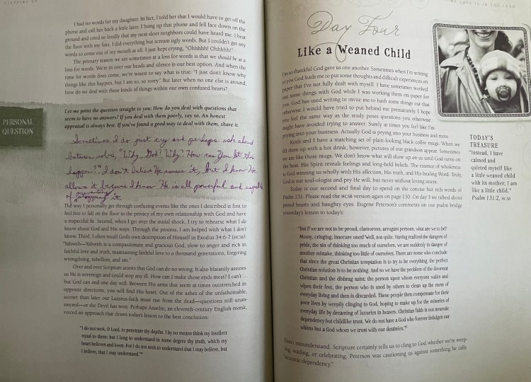 It’s a little surprising to, every so often, come across a day’s study like this one with so little in terms of questions and answers. Especially in this day and age, when the question of staying as calm as a child in its mother’s arms seems increasingly more difficult. And the one line you underlined about God’s identified masculinity looks that much more curious, now that everybody is obsessed with pronouns these days; how do we see Him as a ‘mother,’ when He Himself makes it abundantly clear He is male (despite the theorization by so many modern theologians)?