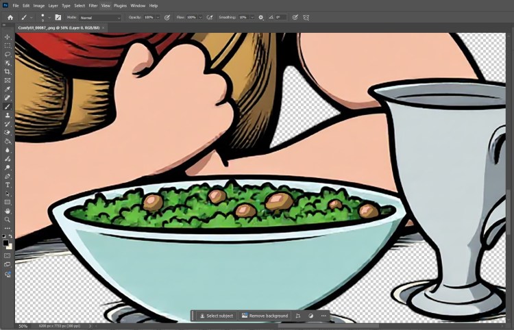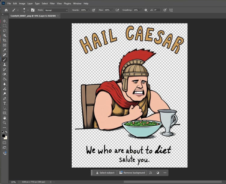 In fairness, a lot of the results were rubbish. Sometimes, for instance, the helmet set on the table (and why would a guy have two helmets, one on his head, and another on the table, in any event?) had a head in it, which gave the image a weird creep factor. Others were just not useful for my purpose, as the computer leaned into the whole “Hail Caesar” bit, and had the guy tucking into his salad with great gusto. Great execution, but not the idea I was trying to convey. I wanted something like disgust, disappointment or just plain resignation.