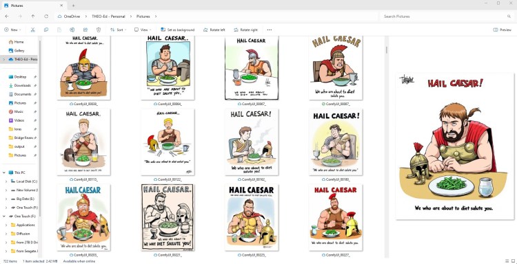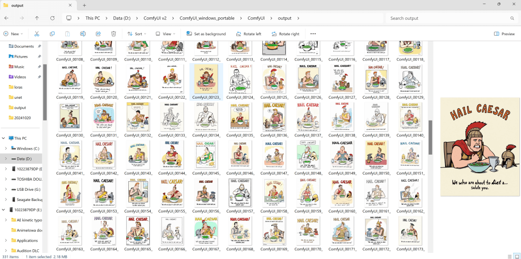 The other reason isn’t quite as obvious at first, but makes a lot more sense when you look at the output the computer generates. It would take me hours to draw one cartoon (assuming I could draw one the way I envision it in my head), but it can generate one every couple of minutes. I basically gave the computer the idea, and let it produce various iterations of the concept: