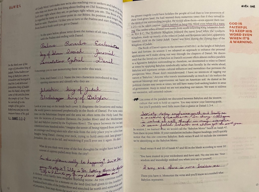 When I initially looked at this first session’s homework, I thought the title was “Choices to Make,” which felt singularly appropriate when I’m trying to look up a new collection of notes to go through and remember each Sunday. Then I discovered that was the theme for the entire week (or, as I intend to relate to it, the next month or so). It also had me wondering if there will be enough of this study on Daniel to last, say, until our own Daniel’s next birthday. Turns out, I needn’t have worried; eleven sessions, with daily homework, will presumably last for an entire year.