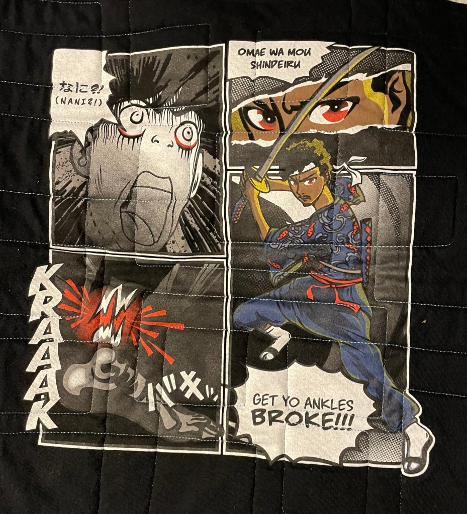 At the same time, there’s a certain forlorn realization that some of the shirts that make up this quilt you never got a chance to wear. Some of them were presents from what turned out to be your last Christmas, and January is no time for one to be wearing T-shirts. So, the one displaying Reki from Haibane Renmei, Rebecca Parham from Let Me Explain Studios, and this manga panel design from CoryXKenshin’s YouTube channel never got brought out of the back we brought them home in after celebrating Christmas at the folks’ until I dug them up and sent them to the quilting company: