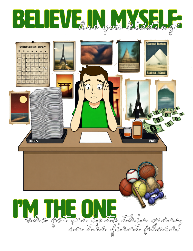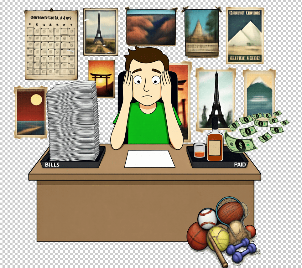 Well, I decided to start with a fellow dealing with a pile of bills on his desk, indicating that he wasn’t good with money. I also asked the computer to do an image of dollar bills flying away from him like a flock of birds, as a slightly surreal image to drive the point home. Somewhere along the line, I also decided to have the computer draw a bottle of whiskey on the desk, both to suggest how he’s dealing with those bills, and perhaps how he got burdened by them in the first place, to a certain extent. Then, I thought I’d add elements to suggest plans he jumped at and abandoned – like, for instance, attempts to get into shape – and others he’d considered, but never got around to for one reason or another – such as traveling. The first, I represented as sporting equipment covered in dust and spiderwebs (although the program couldn’t seem to figure out how to do either of those very well), and the other as a calendar and a series of travel posters that were worn and yellowed in their having been ignored for so long.