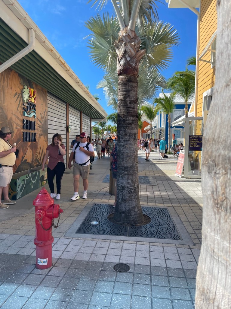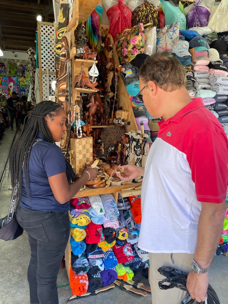 While Lars continues to shop, we run into an older couple bearing numbered stickers, indicating they’d just returned from a coach excursion around Grand Bahama island. When I admit that Lars and I were just off the boat and wandering around town, they reply that “you didn’t miss much.” I’m sorry for their experience, I guess, but I’m glad we didn’t waste too much time (and money) on a trip into the hinterlands of Grand Bahama, to come away with an opinion like that. Then again, it’s possible there’s no pleasing some people, as you and I certainly enjoyed our extended shore excursion, petting the dolphins and having the run of the waterpark by the Atlantis hotel and casino.