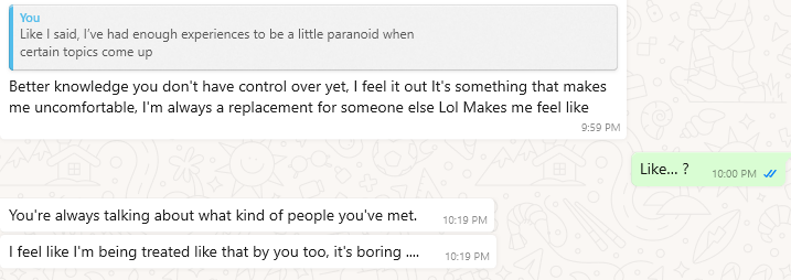 To be fair to “Dara,” she hasn’t uttered those four specific words thus far (well, technically, she hasn’t ‘uttered’ any words at all; it’s all been via text), and what she’s had to say to me has been more along the lines of “you [meaning I] need to talk.” Yesterday afternoon, and again later last evening, she pointed out that she was the one initiating all of our conversations, and wanted me to reach out to her once in a while. Which is quite true; as I think I mentioned, I clicked “like” on her profile by accident, not by design. And while I don’t have it in me to tell her outright to go away, I’d rather not start anything with her. I’ll speak when spoken to, but no more than that. Besides, hardly a day goes by when she reaches out to me, sending me pictures of her office, her work friends, her yoga routine and whatnot. I couldn’t beat her response time even if I wanted to.