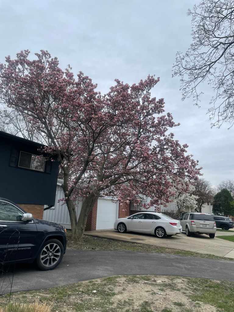 But here, we most definitely could. I could spread out a blanket on that little half-moon circle of grass between our turnaround driveway and the sidewalk, lie down on it, and stare up at the blossoms as they sway in the wind. Granted, they aren’t nearly as fragile as the sakura blossoms – even a fairly strong shower on Easter Sunday couldn’t dislodge many of them from the trees they still obstinately cling to – nor are they as small and delicate, with each petal the size of a human finger (or several, in the case of the nearby magnolia tree). But does that distract from their beauty?