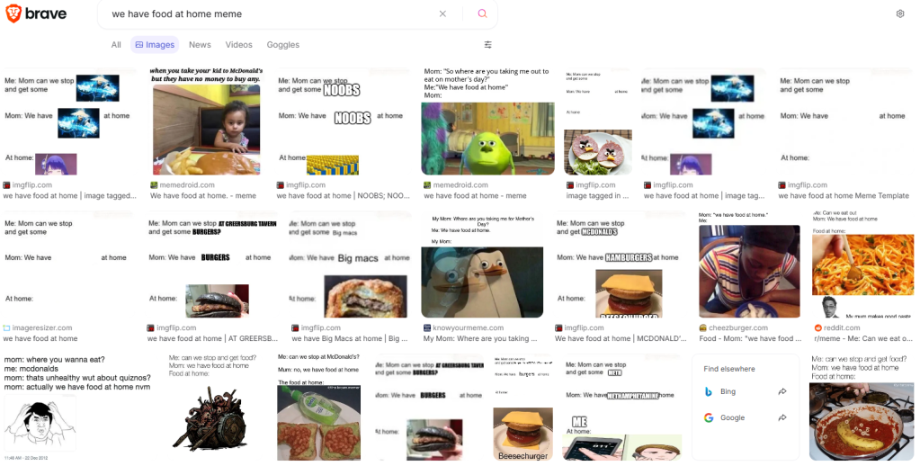 It’s so memetic that there isn’t a single iconic image to represent it; all there is to it is a basic script. Child asks for restaurant food (usually from a low-grade fast-food place – and yes, I know that’s something of a redundancy), to which the mom replies that “we have food at home,” only for the picture showing what the “food at home” looks like is… well, not to put too fine a point on it, less than appetizing. The options are so varied, it requires a screenshot of the query: