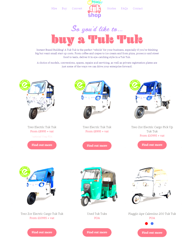 Interestingly, these British offerings seem to be touted as the bases of mobile businesses; often geared for small deliveries, mostly of hot food. Indeed, he offers customized models that serve as mini food trucks – although there’s no way to have a mobile kitchen in the back of one of these, like with the food trucks we generally think of and see on this side of the pond. And of course, they can serve as taxicabs, albeit a far cry from the iconic black hansom cabs of London. Hey, not everyone can afford that means of getting around – they aren’t quite limousines, but they have a similar cachet and price tag.