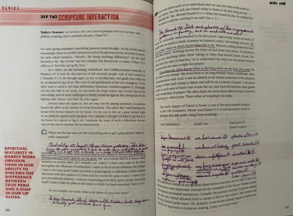 For all that these daily homework assignments didn’t give you much room for your voice (and in any event, you were usually scrambling to fill everything in on the day before – or of – your weekly study sessions), there are almost always a question or two where you display flashes of your personality in them, even as the lessons you describe as having learned border on the universal. Consider how, in the midst of your last-minute preparations, you find yourself sensing God telling you to slow down and remember what’s truly important – even if it was only a matter of making sure everything was copacetic at home before leaving. Give yourself credit for that honey – by comparison, will leave a place without giving it a moment’s thought anymore (and for that matter, I used to tease you about your constant “one more thing” as we would try to go anywhere).