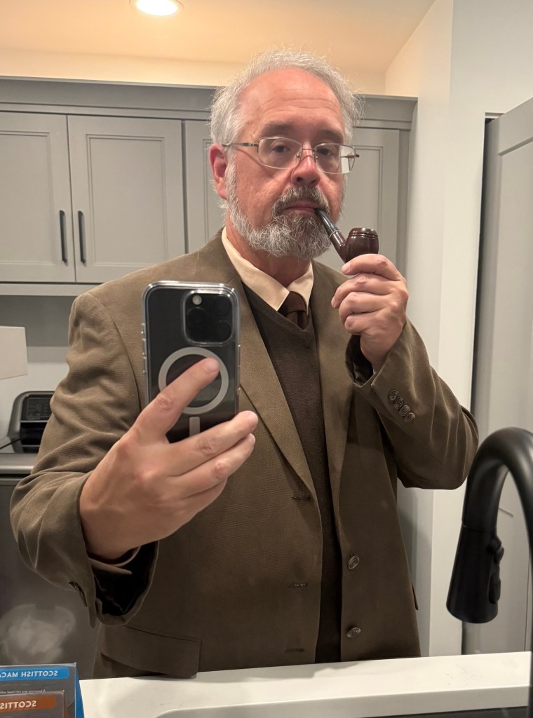 Aside from the pipe, which is nothing more than a prop from Spirit Halloween (yes, that notorious cheap-jack place that pops up in any space where a business has recently gone out of business – meaning it has no shortage of potential locations), everything here is straight out of my closet. I know your dad left behind a few old pipes, so I might not have had to shop for this cheap replacement, but I wouldn’t know where to look for any of them, and that’s assuming I didn’t get rid of them in the purge lo these many years back.