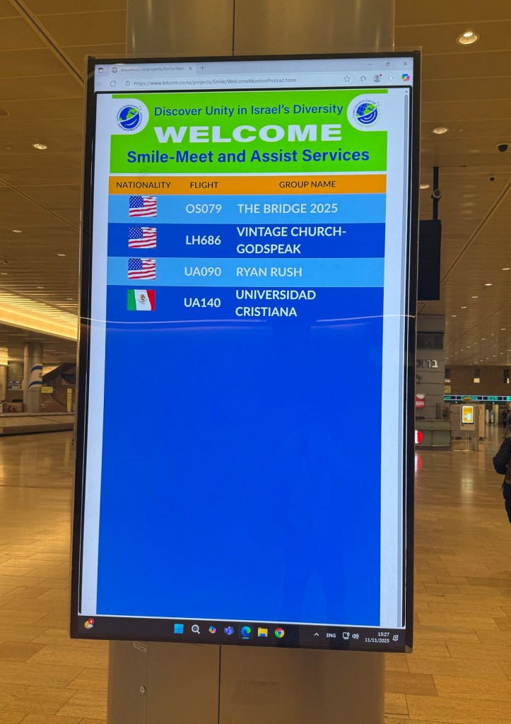 There’s a reason I’m wearing that “this ain’t my first rodeo” shirt for this trip, and it has more to do with the fact that two or three rodeos don’t make one an expert. Just because Ben Gurion airport is familiar after four visits (seven, if you count the return flights as a separate visit) doesn’t mean I know all the protocols to go through once we’re here. Thank heaven we were greeted by a couple of fellows holding signs indicating our group.