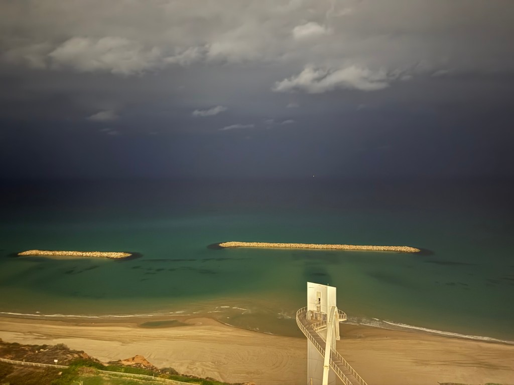Apparently, there used to be a walkway to the beach (and supposedly, they’re working on building a new one that should be open… by next year, which is meaningless for right now), but we never checked it out because it was too dark when we arrived on previous trips. Indeed, I think this is the first time we’ve gotten to the hotel in time to catch dinner (and considering that we hadn’t eaten since the tail end of the ORD-VIE trip, that was important for us). Meanwhile, the morning will be a short one as well (as they always are), with us taking leave of the place fifteen minutes before eight. For all that there are already people wishing we could stay here longer (one even wondering if Jesus walked through Netanya during his ministry. I’d wager He did, but that there wasn’t a city as such to walk through at the time). I get the feeling, and kind of agree with them, but at the same time, know that there’s more to take in elsewhere, and we need to rest up so as to be ready to do so when morning comes.