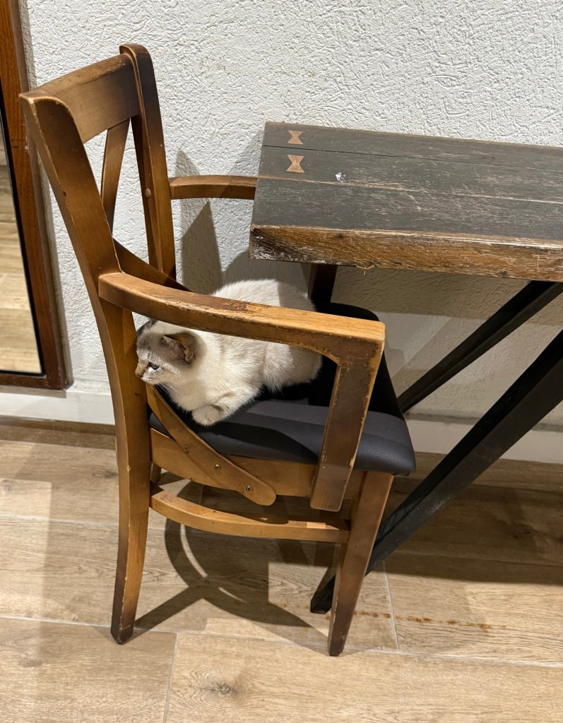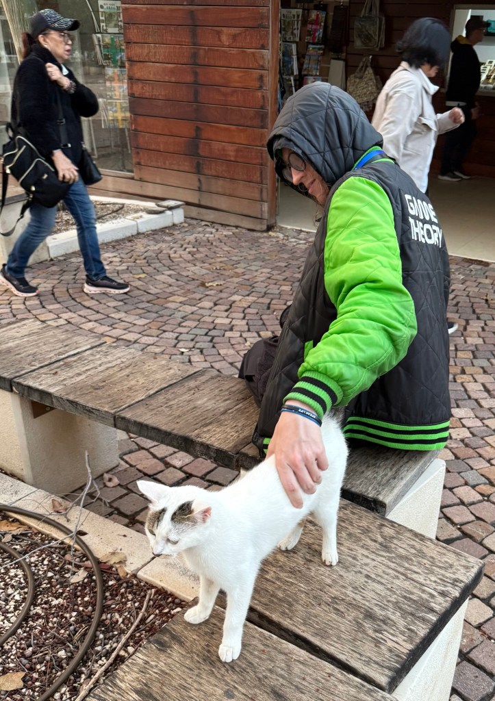 One of the things I wasn’t expecting at our lodging in Ginosar was that the place is… well, I wouldn’t say overrun, as such, but surprisingly populated with cats. To be sure, the existence of semi-feral cats in a place serves a purpose; we’ve just been dealing with a mouse problem at home, after all. But it is a little odd to see these creatures wandering around, totally indifferent to the presence of the constant flow of guests in and out of the complex.