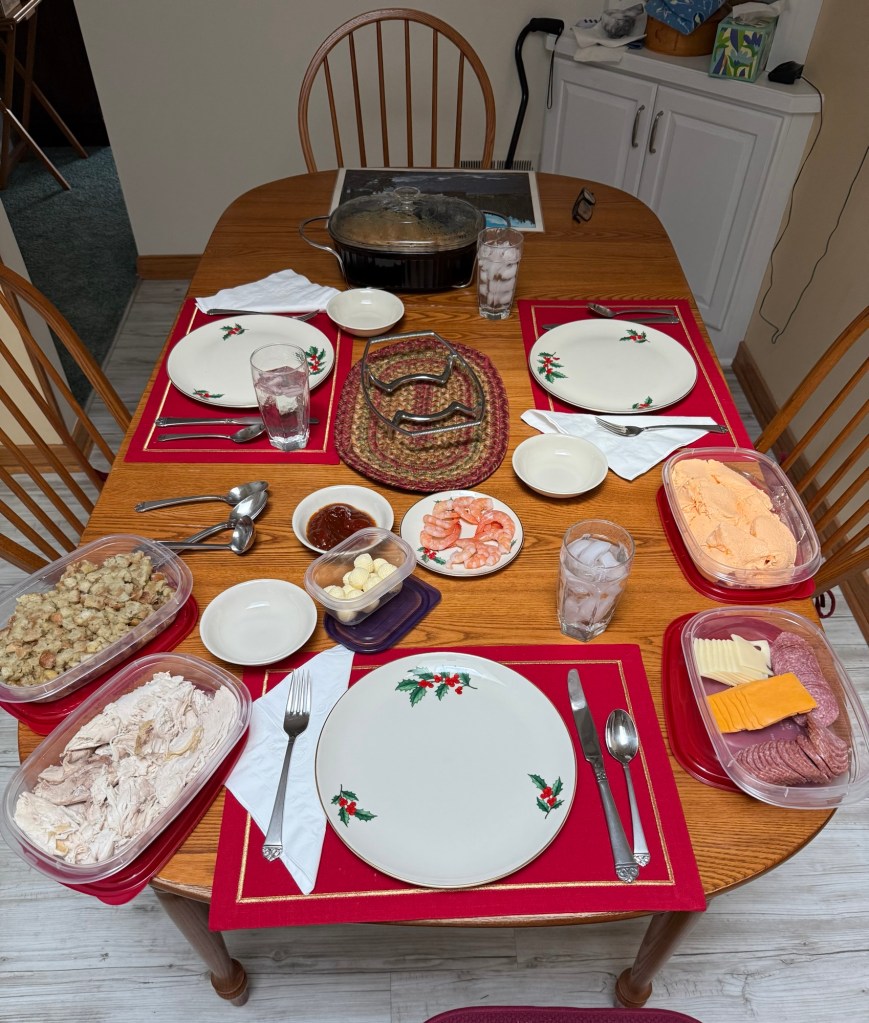 Eventually, after some back-and-forth, it was decided that I would do what little cooking I was assigned, bring the casserole over to Jenn and her family, at which point they would ladle what they wanted into a serving dish for their own use. At the same time, she would provide me with disposable containers that she would fill with the dishes she had prepared for the meal, and Daniel and I would take them over to the folks’ place for the four of us to enjoy. Thus, with four of us at one place (Jenn, Bill and the kids) and the other four (Mom, Dad, Daniel and I) at another, we would spend the holiday divided into halves, for safety’s sake.