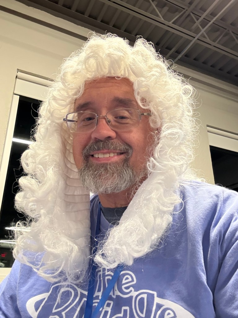 As for myself, I didn’t throw myself into these theme nights with your level of abandon. Part of this was due to the fact that some of them – like “team color” nights, for example – didn’t (and don’t) apply to me. I’m not in charge of any of the groups of kids, on any team; as a record-keeper for the club, it’s actually incumbent upon me not to show favoritism to one team or another. Besides, these days, we’re required to wear these pale blue shirts to indicate that we’re volunteer staff, and not some rando wandering around the church who shouldn’t be. Yeah, that’s a concern; not so much at our location as in society at large, so these ‘uniforms’ are as much a security precaution as anything else.