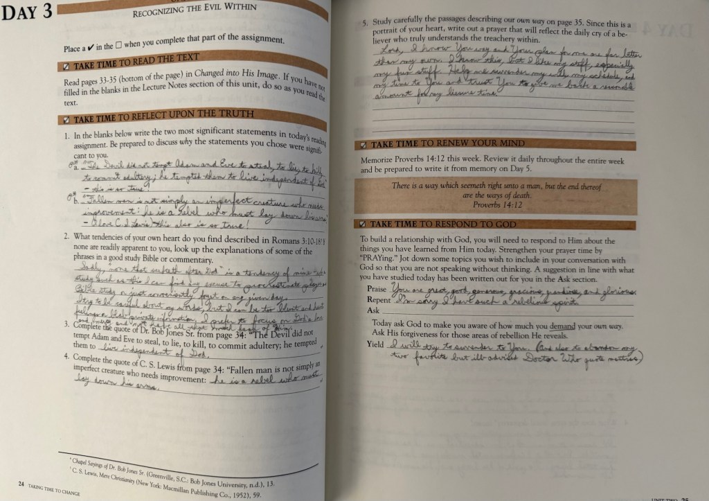 Still, as much as you could berate yourself for not studying and taking notes independently, the fact that you took the time to involve yourself with a study such as this (and many more both before and after this one) just goes to show that you made a point to take steps to force yourself to do so, and remain accountable to others about it as well. It’s not something I’ve ever made much of a point to do myself; I may try to read the Bible every day, but it isn’t as if I take notes, or even try to read too terribly deeply into a given passage if I find myself in a hurry.