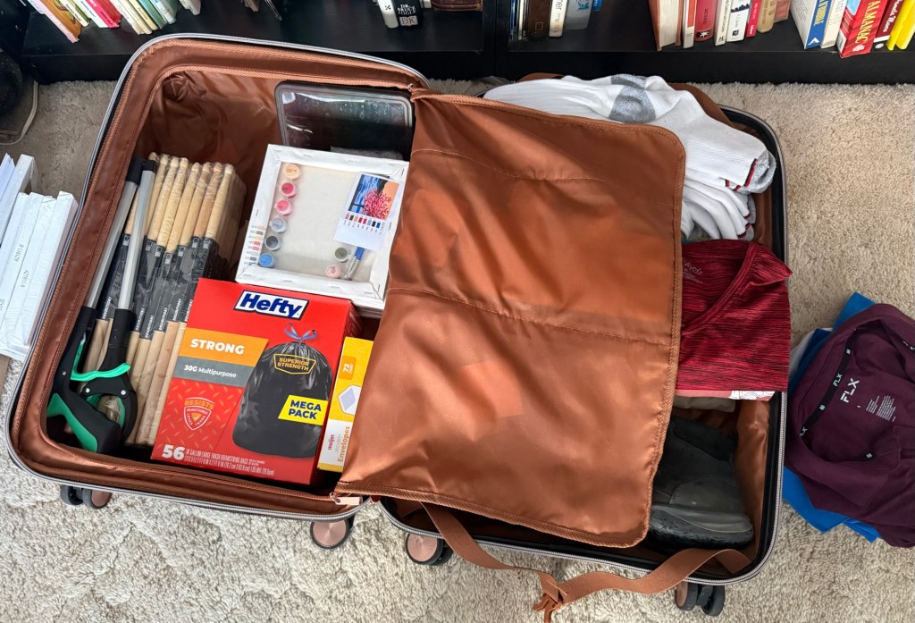 Except… my stuff isn’t everything that I’m taking with me. At the briefing on Sunday, it was mentioned that there were some supplies that needed to be brought down with us, and those of us who were checking baggage were asked if we would be willing to make room for such supplies; basically, it was like last time around, when I carted some of the power tools for another traveler when his bag was overweight. This time around, I doubt that weight is going to be the real problem as much as sheer volume.