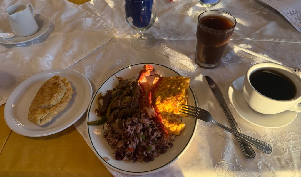 The food is lovely as always (including omelets and empanadas, neither of which I’d seen before on offer), if surprisingly a little tepid at this early hour. Then again, they had been serving breakfast for fifteen minutes already – and I’d spent a little time after that running down coffee and juice – so I can’t blame the restaurant for that.