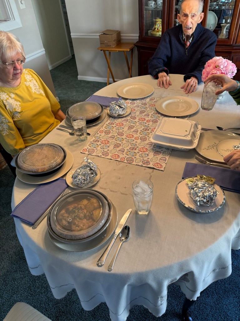 Well, as it turned out, I didn’t have to. Despite having possibly been asleep Saturday night when it was originally sent (and causing them concern about how they could get in touch with me in a real emergency), when I checked my phone in the morning, I realized I’d getting a text from the folks to call them. The fact that Daniel and I weren’t a health hazard meant that we could still come over – I’d pick something up from one of the local places we used to go to as a family (it’s more in our neighborhood than theirs, anyway) – and have a somewhat low-key Easter dinner together with them after all. And while I’d originally decided to finish off some leftovers from the get-together at Erin’s (despite there only being enough for myself – although you should know that Daniel doesn’t do leftovers), I was more than happy to do so.
