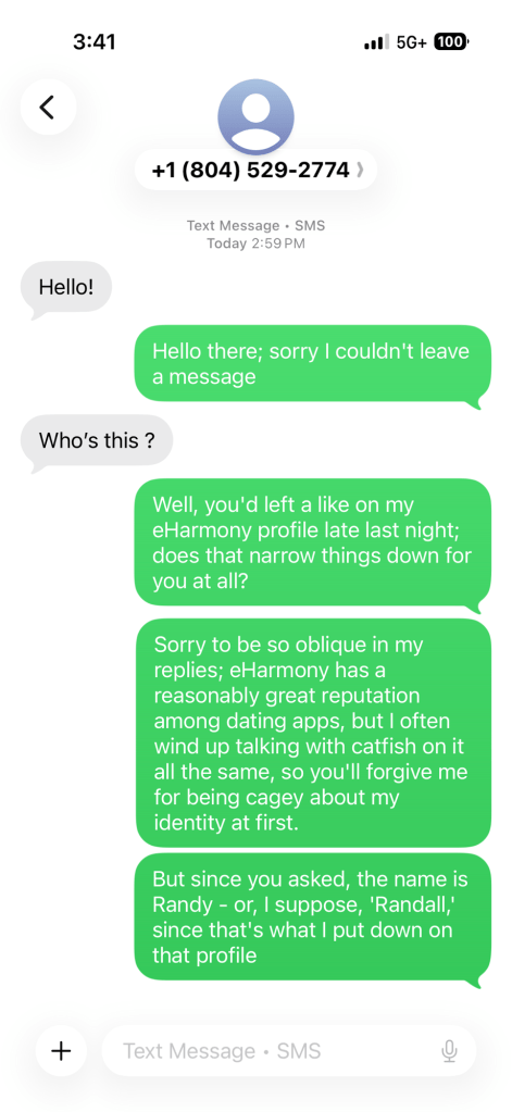 It doesn’t help that, when I visited her profile, I only found a single photo (which, while it doesn’t guarantee anything, is a bit of a red flag), and a stated location of Chicago, despite her phone number indicating ‘she’s’ from somewhere in eastern Virginia. Again, there are a lot of people with cell phones from previous homes (Erin is a case in point), but it’s another warning sign; and in any case, while I admit that people actually do live in Chicago, I’m not sure I want to mess with going into the city proper to meet someone anyway.