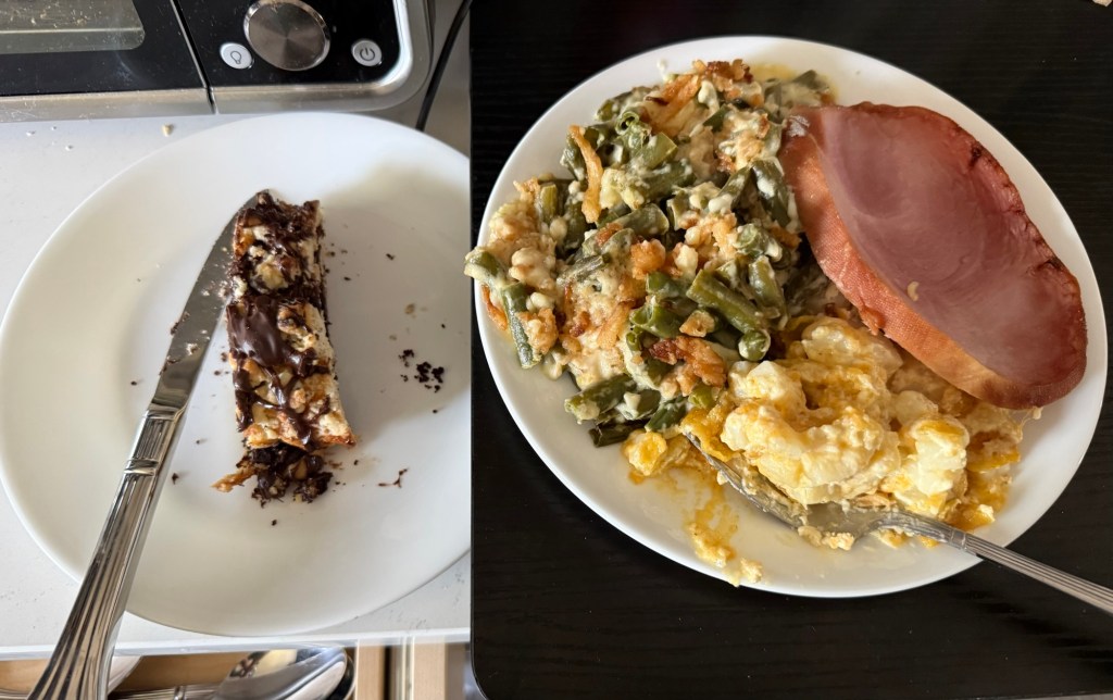 Of course, I don’t have last night’s meal to reconstitute for this morning (and in any event, burger joint fare doesn’t reheat very well at all), but after our belated ‘Easter’ dinner from last Sunday, Daniel and I were sent home not just with half of the vegetable casserole we had brought, but also a goodly portion of our family’s traditional potato dish and a number of thick slices of ham. So why not use that for my breakfast, since it all heats up pretty well, and it needs to be used up in any event?